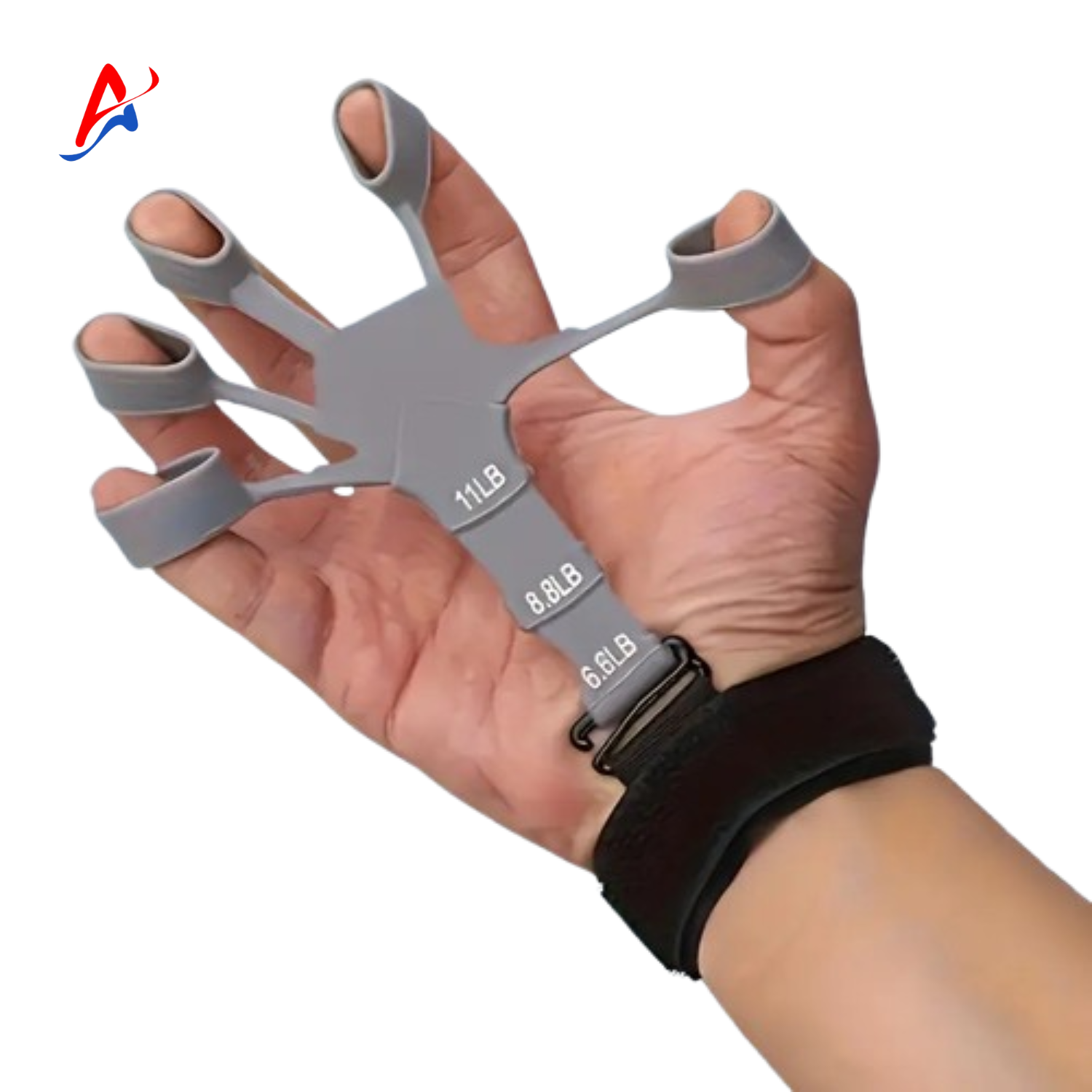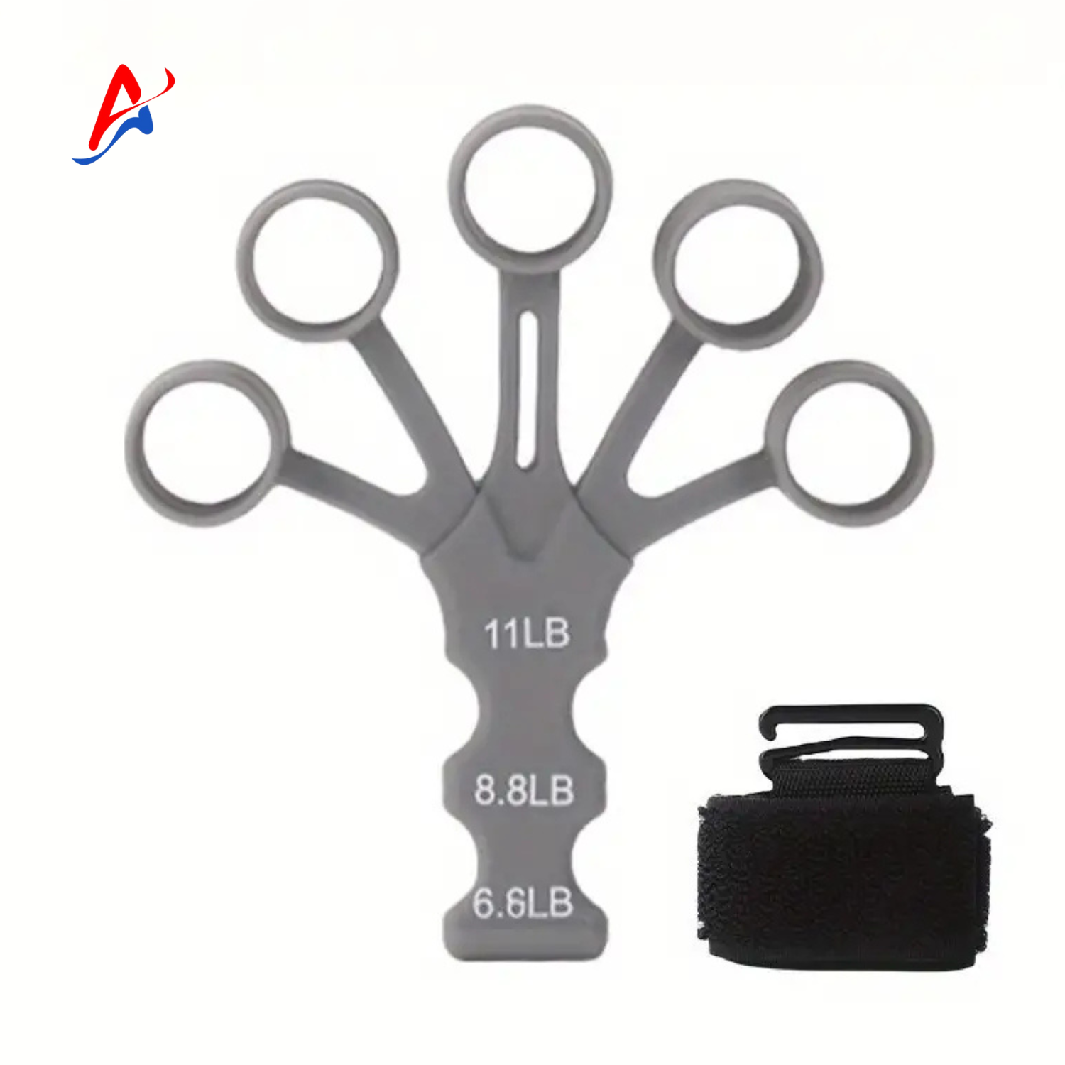 Adjustable silicone trainer with five finger slots and a wrist strap for customizable resistance.